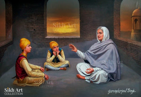 The elder sons, Baba Ajit Singh Ji and Baba Jujhar Singh Ji, fought bravely in the Battle of Chamkaur and were martyred on 7th December 1705.The younger sons, Baba Zorawar Singh Ji (9 years old) and Baba Fateh Singh Ji (7 years old), were captured by Mughal soldiers and kept with their grandmother, Mata Gujri Ji.