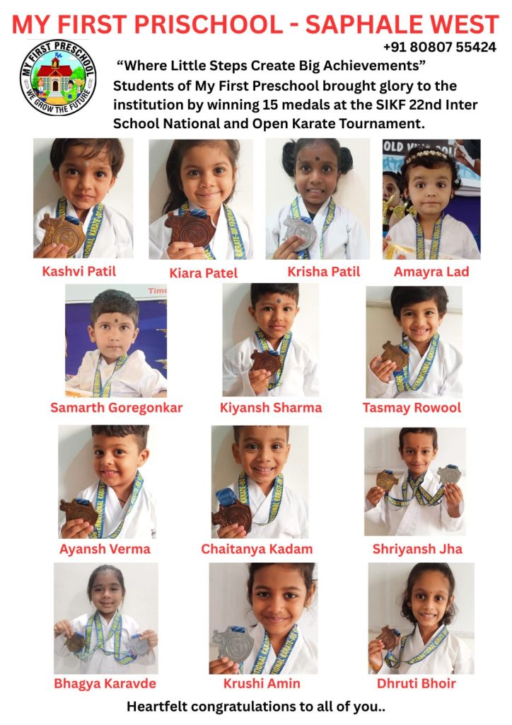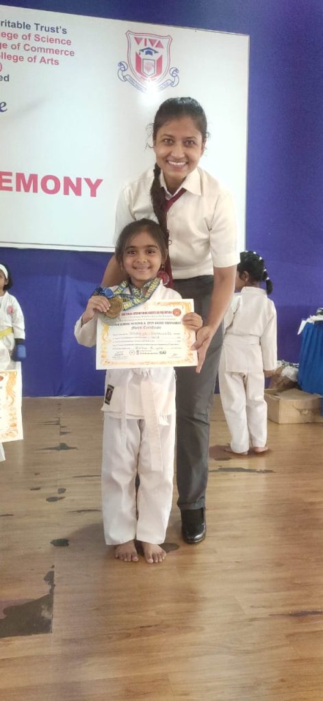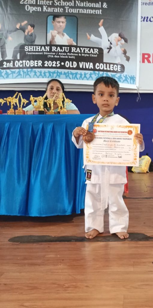 Students brought glory to the institution by winning 13 medals at the SIKF 22nd Inter School National and Open Karate Tournament. The proud medal winners are Kashvi Patil, Krisha Patil, Amayra Lad, Kiara Patel, Bhagya Karavde, Dhruti Bhoir, Krushi Amin, Tasmay Rowool, Chaitanya Kadam, Samarth Goregonkar, Kiyansh Sharma, Ayansh Verma, Shriyansh Jha. Their hard work, discipline, and determination shone brightly in the competition. Principal Anjali Naik, along with the dedicated teachers and staff, congratulated the young achievers. “We are extremely proud of our students’ success, which reflects their discipline and hard work. We will continue to support and nurture every child to reach greater heights.